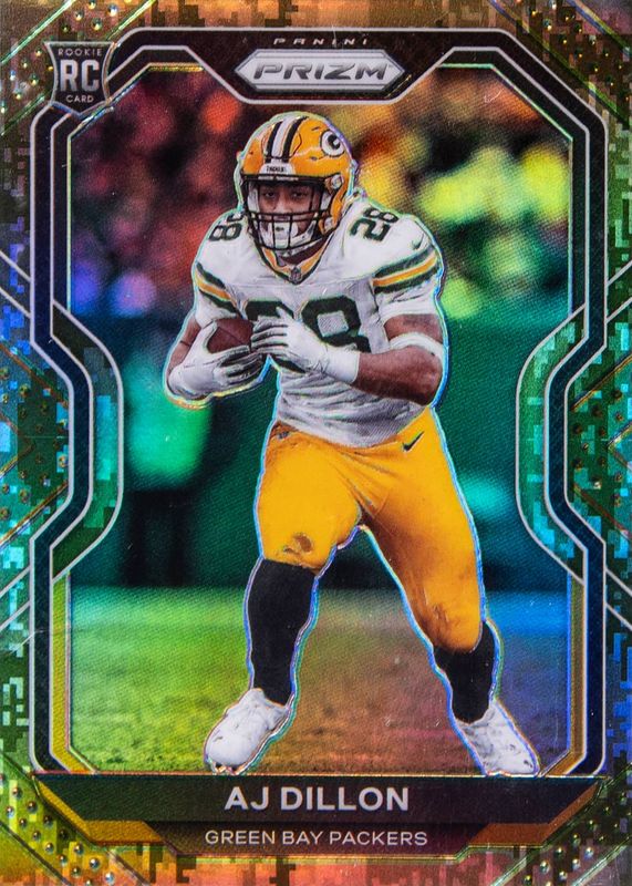 This card is 1 of 61 AJ Dillon's card variations in the 2020 Prizm set being tracked by Sports Card Investor, including Base, Disco, Green, Lazer, and Light Blue.