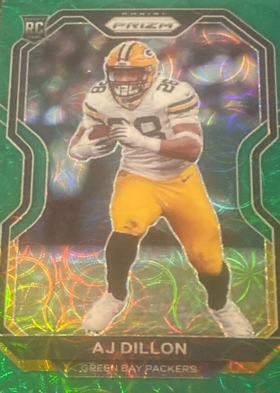 This card is 1 of 61 AJ Dillon's card variations in the 2020 Prizm set being tracked by Sports Card Investor, including Base, Disco, Green, Lazer, and Light Blue.