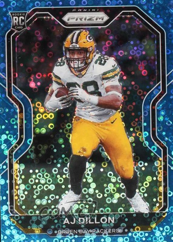 This card is 1 of 61 AJ Dillon's card variations in the 2020 Prizm set being tracked by Sports Card Investor, including Base, Disco, Green, Lazer, and Light Blue.