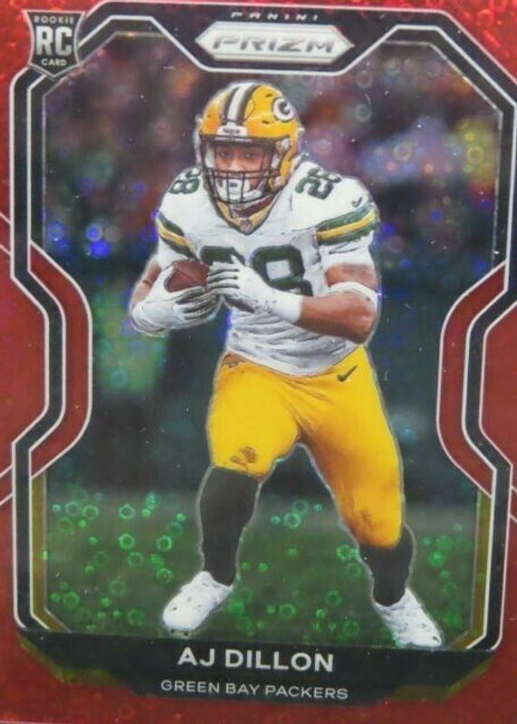 The AJ Dillon 2020 Prizm #364 No Huddle Red /50 Rookie card in Raw condition has not changed in price in the last 30 days and was last sold for $15.00 .