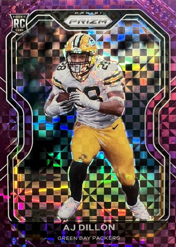 The AJ Dillon 2020 Prizm #364 Purple Power /49 Rookie card in Raw condition has not changed in price in the last 30 days and was last sold for $10.50 .