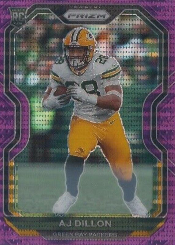The AJ Dillon 2020 Prizm #364 Purple Pulsar Rookie card in Raw condition has not changed in price in the last 30 days and was last sold for $39.95 .