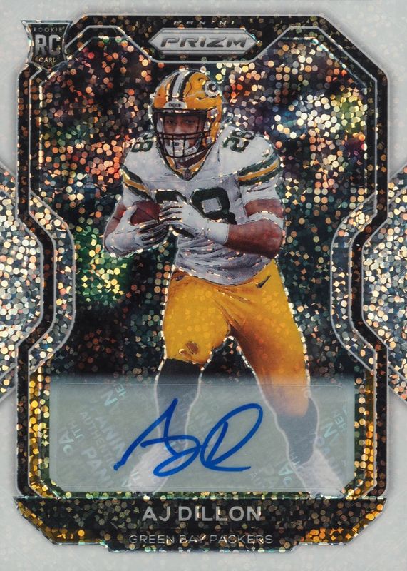 This card is 1 of 61 AJ Dillon's card variations in the 2020 Prizm set being tracked by Sports Card Investor, including Base, Disco, Green, Lazer, and Light Blue.