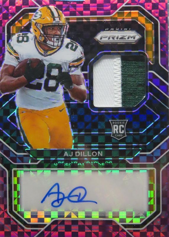 The AJ Dillon 2020 Prizm #36 Rookie Patch Auto - Purple Power /49 card in Raw condition has not changed in price in the last 30 days and was last sold for $10.50 .