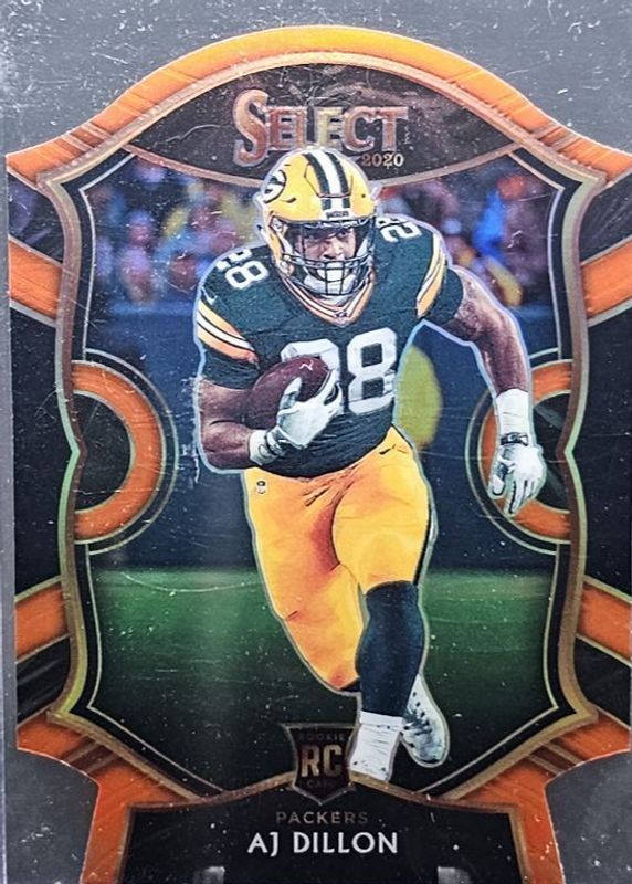 The AJ Dillon 2020 Select #65 Concourse Orange Die-Cut Rookie card in Raw condition has not changed in price in the last 30 days and was last sold for $1.00 .