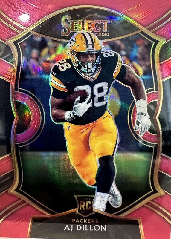 The AJ Dillon 2020 Select #65 Concourse Pink /10 Rookie card in Raw condition has not changed in price in the last 30 days and was last sold for $18.50 .
