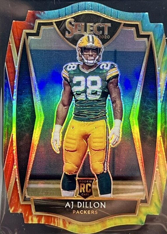 The AJ Dillon 2020 Select #165 Premier Level Tie-Dye Die-Cut /25 Rookie card in Raw condition has not changed in price in the last 30 days and was last sold for $13.95 .