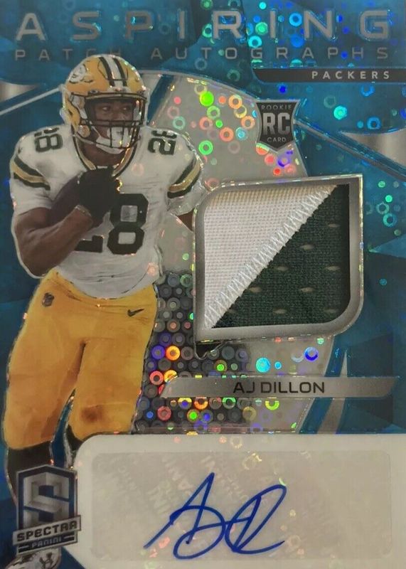 The AJ Dillon 2020 Spectra #14 Aspiring Patch Autographs - Neon Blue (/60) Rookie card in Raw condition has not changed in price in the last 30 days and was last sold for $27.95 .