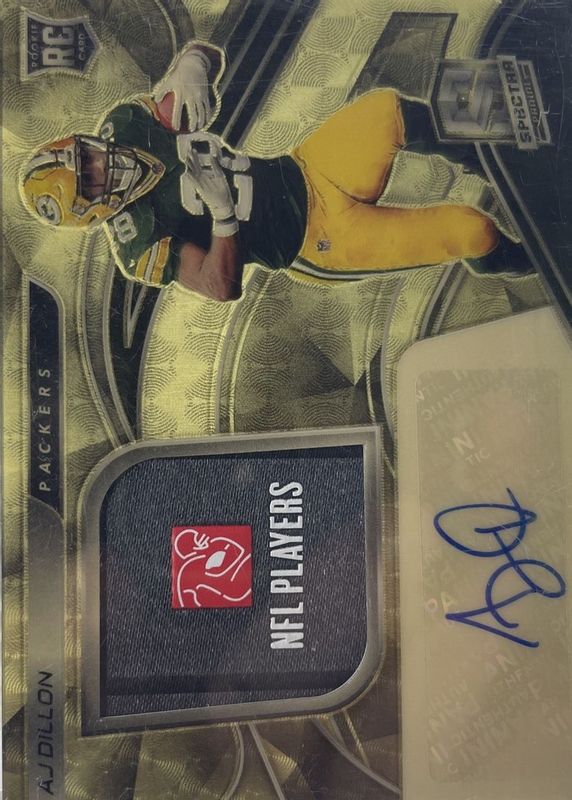The AJ Dillon 2020 Spectra #228 Rookie Patch Auto - Laundry Tag Gold NFLPA Logo /1 card in Raw condition has not changed in price in the last 30 days and was last sold for $202.50 .