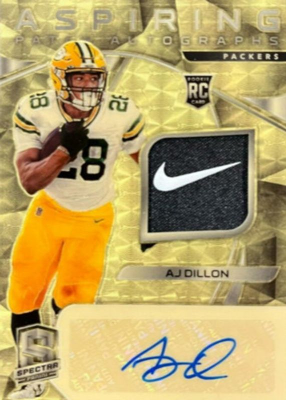 The AJ Dillon 2020 Spectra #228 Rookie Patch Auto - Laundry Tag Gold Nike Swoosh /1 card in Raw condition has not changed in price in the last 30 days and was last sold for $153.50 .