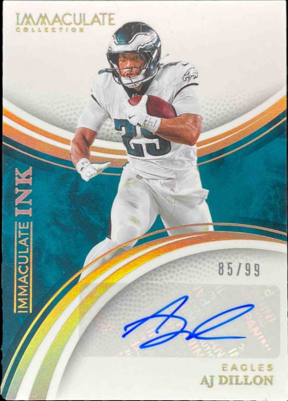 The AJ Dillon 2025 Immaculate #10 Immaculate Ink /99 card is 1 of 2 AJ Dillon's card variations in the 2025 Immaculate set being tracked by Sports Card Investor, including Immaculate Ink - Platinum /1.