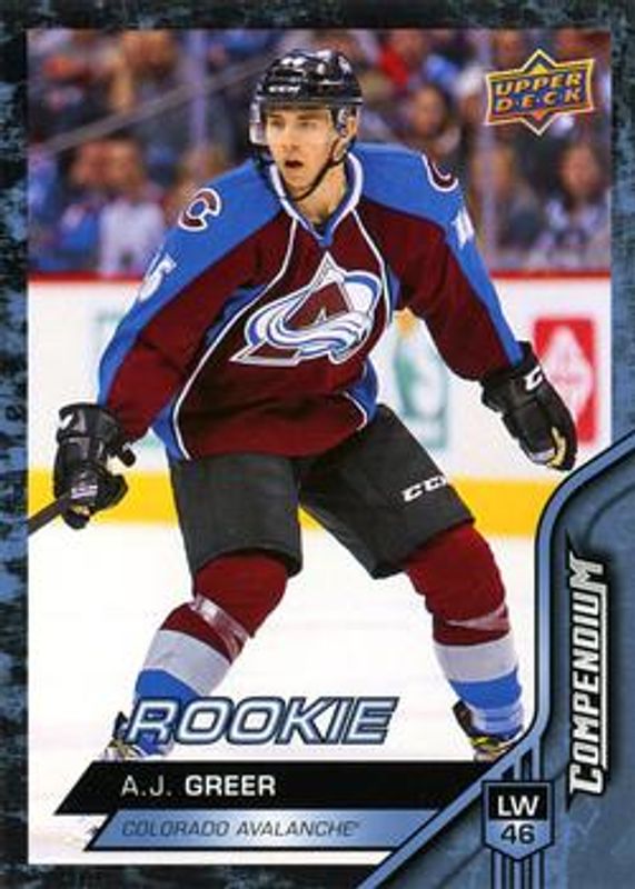 The AJ Greer 2016 Upper Deck Compendium #881 Blue Rookie card is 1 of 7 AJ Greer's card variations in the 2016 Upper Deck Compendium set being tracked by Sports Card Investor, including Gold, Red, Printing Plates Black /1, Printing Plates Cyan /1, and Printing Plates Magenta /1.