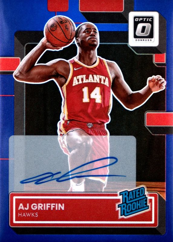 The AJ Griffin 2022 Optic #204 Rated Rookie Signatures - Purple card in Raw condition has not changed in price in the last 30 days and was last sold for $2.00 .
