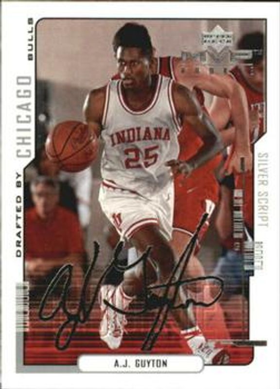 The AJ Guyton 2000 Upper Deck MVP #201 Silver Script Rookie card is 1 of 4 AJ Guyton's card variations in the 2000 Upper Deck MVP set being tracked by Sports Card Investor, including Base, Gold Script /100, and Super Script /25.
