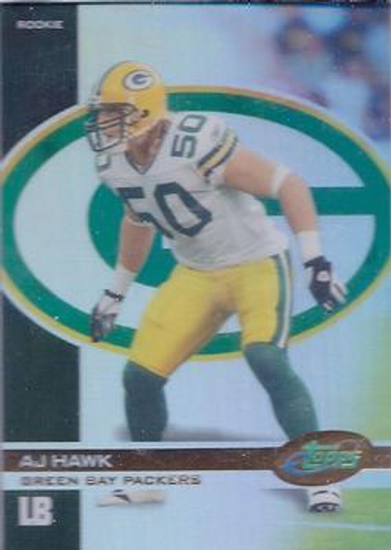 AJ Hawk's Football cards are available in at least 4 sets. AJ Hawk's biggest 7-day price movers are 2006 eTopps #24 Base /849, 2006 Topps #360 Base, and 2006 Topps Chrome #222 Refractor.