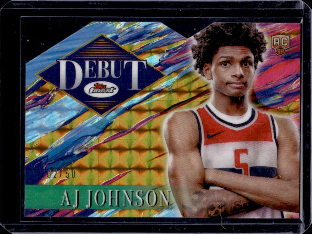 The AJ Johnson 2024 Topps Finest #D-26 Debut - Gold Geometric Refractor /50 Rookie card is 1 of 117 AJ Johnson's card variations in the 2024 Topps Finest set being tracked by Sports Card Investor, including Arrivals, Arrivals - Geometric Refractor, Arrivals - Refractor, Arrivals - X-Fractor, and Base Rare.