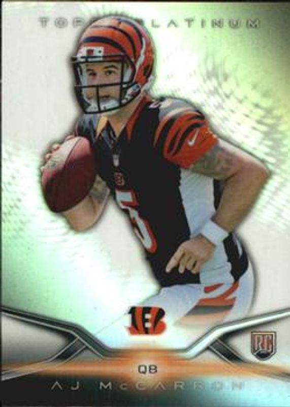 The AJ McCarron 2014 Topps Platinum #124 Base Rookie card is 1 of 47 AJ McCarron's card variations in the 2014 Topps Platinum set being tracked by Sports Card Investor, including Black Refractor, Blue Wave Refractor, Orange Refractor, X-Fractor, and Pulsar Refractor /99.