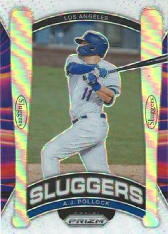 The AJ Pollock 2021 Prizm #SL8 Sluggers - Silver card is 1 of 5 AJ Pollock's card variations in the 2021 Prizm set being tracked by Sports Card Investor, including Sluggers, Sluggers - Gold /10, Sluggers - Black Finite /1, and Sluggers - Gold Vinyl /1.