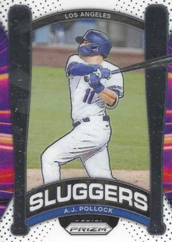 The AJ Pollock 2021 Prizm #SL8 Sluggers card is 1 of 5 AJ Pollock's card variations in the 2021 Prizm set being tracked by Sports Card Investor, including Sluggers - Silver, Sluggers - Gold /10, Sluggers - Black Finite /1, and Sluggers - Gold Vinyl /1.
