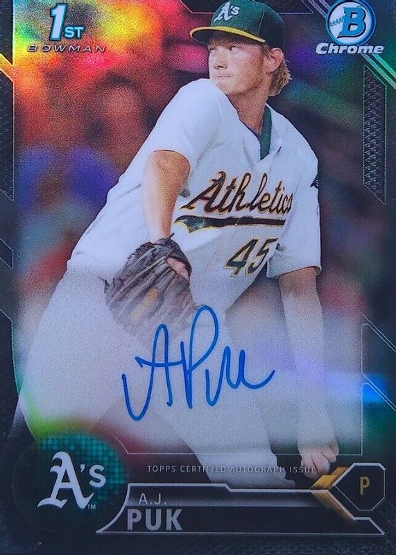 The AJ Puk 2016 Bowman Draft #CDA-AP Chrome DP Auto - Black Refractor /75 (1st) card in Raw condition has not changed in price in the last 30 days and was last sold for $11.50 .