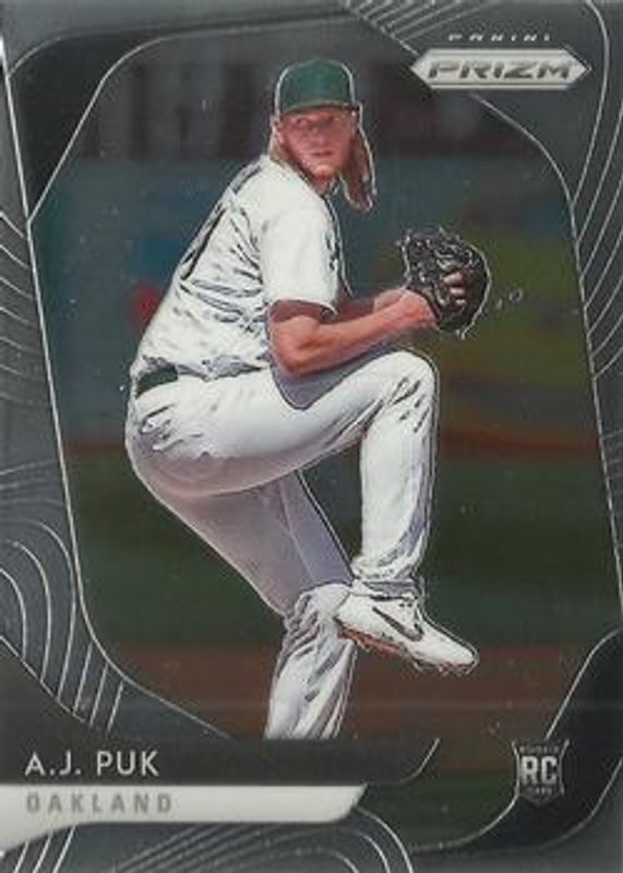The AJ Puk 2020 Prizm #194 Base Rookie card is 1 of 62 AJ Puk's card variations in the 2020 Prizm set being tracked by Sports Card Investor, including Blue, Carolina Blue, Cosmic Haze, Green, and Pink.