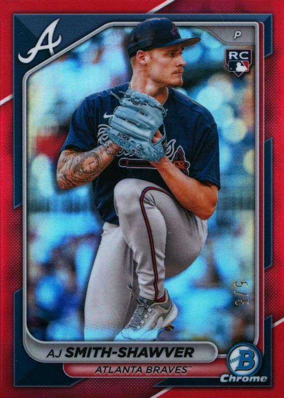 This card is 1 of 13 AJ Smith-Shawver's card variations in the 2024 Bowman Chrome set being tracked by Sports Card Investor, including Base, Refractor /499, Fuchsia Refractor /299, Aqua RayWave Refractor /199, and Blue Refractor /150.