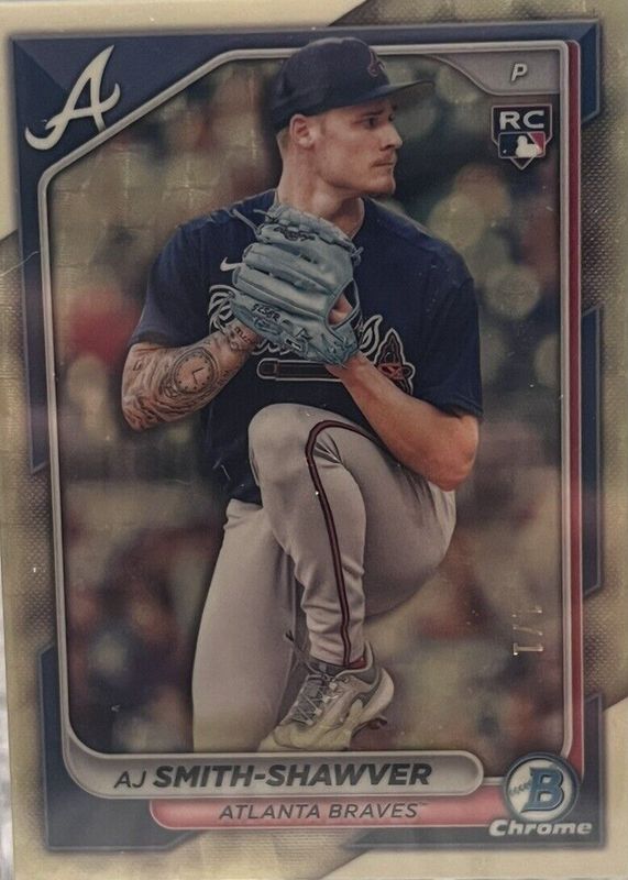 This card is 1 of 13 AJ Smith-Shawver's card variations in the 2024 Bowman Chrome set being tracked by Sports Card Investor, including Base, Refractor /499, Fuchsia Refractor /299, Aqua RayWave Refractor /199, and Blue Refractor /150.