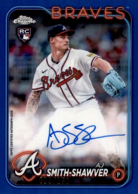 The AJ Smith-Shawver 2024 Topps Chrome #RA-AJS Rookie Autographs - Blue Refractor /150 card in Raw condition has not changed in price in the last 30 days and was last sold for $34.99 .