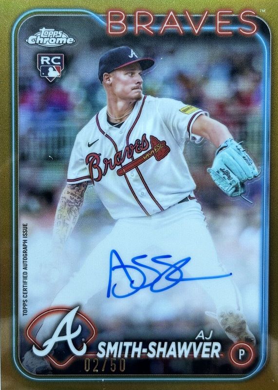 The AJ Smith-Shawver 2024 Topps Chrome #RA-AJS Rookie Autographs - Gold Refractor /50 card in Raw condition has not changed in price in the last 30 days and was last sold for $46.00 .