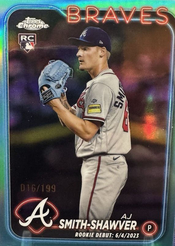 This card is 1 of 46 AJ Smith-Shawver's card variations in the 2024 Topps Chrome Update set being tracked by Sports Card Investor, including Rookie Debut, Rookie Debut - Negative Refractor, Rookie Debut - Prism Refractor, Rookie Debut - Refractor, and Rookie Debut - X-Fractor.