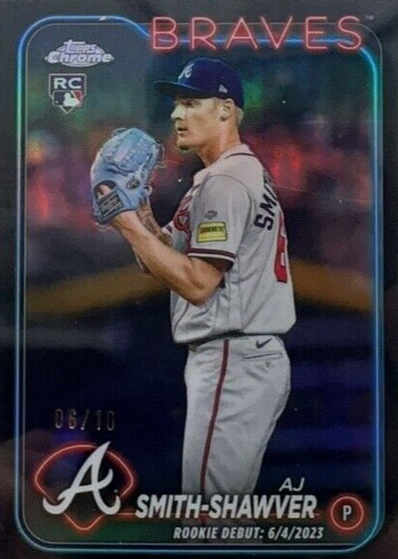 This card is 1 of 46 AJ Smith-Shawver's card variations in the 2024 Topps Chrome Update set being tracked by Sports Card Investor, including Rookie Debut, Rookie Debut - Negative Refractor, Rookie Debut - Prism Refractor, Rookie Debut - Refractor, and Rookie Debut - X-Fractor.