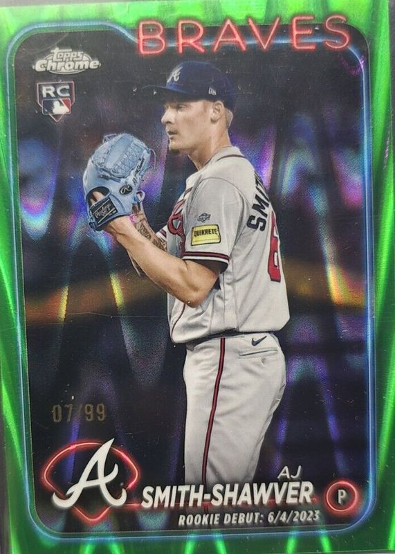 The AJ Smith-Shawver 2024 Topps Chrome Update #USC87 Rookie Debut - Green RayWave Refractor /99 card in Raw condition has not changed in price in the last 30 days and was last sold for $9.99 .