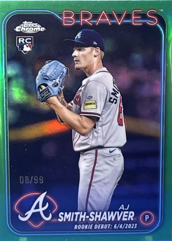 This card is 1 of 46 AJ Smith-Shawver's card variations in the 2024 Topps Chrome Update set being tracked by Sports Card Investor, including Rookie Debut, Rookie Debut - Negative Refractor, Rookie Debut - Prism Refractor, Rookie Debut - Refractor, and Rookie Debut - X-Fractor.