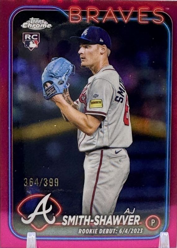 The AJ Smith-Shawver 2024 Topps Chrome Update #USC87 Rookie Debut - Magenta Refractor /399 card in Raw condition has not changed in price in the last 30 days and was last sold for $1.99 .
