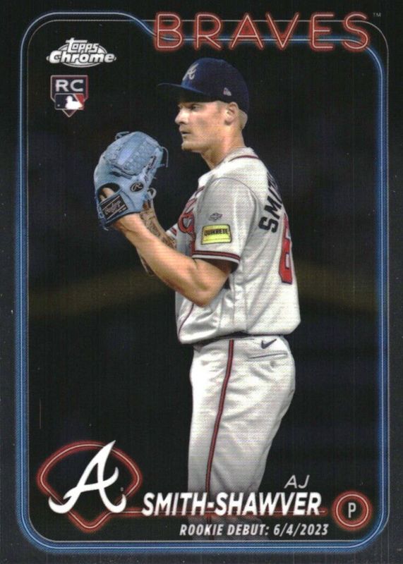 This card is 1 of 46 AJ Smith-Shawver's card variations in the 2024 Topps Chrome Update set being tracked by Sports Card Investor, including Rookie Debut - Negative Refractor, Rookie Debut - Prism Refractor, Rookie Debut - Refractor, Rookie Debut - X-Fractor, and Rookie Debut - Magenta Refractor /399.