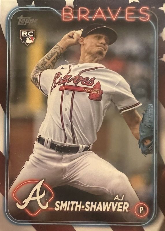The AJ Smith-Shawver 2024 Topps #117 Independence Day /76 Rookie card in Raw condition has not changed in price in the last 30 days and was last sold for $30.00 .