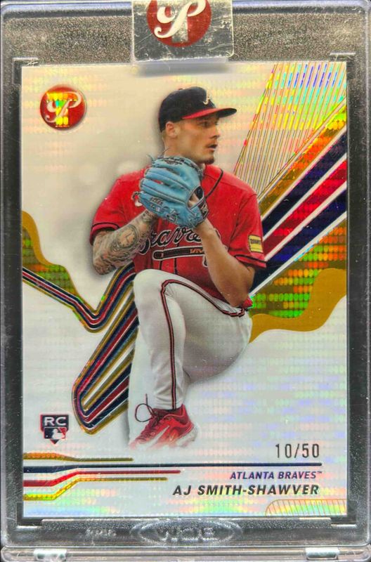 The AJ Smith-Shawver 2024 Topps Pristine #4 Pristine Gold Refractor /50 Rookie card is 1 of 26 AJ Smith-Shawver's card variations in the 2024 Topps Pristine set being tracked by Sports Card Investor, including Base, Pristine Refractor, Refractor, Green Refractor /150, and Pristine Purple Refractor /99.