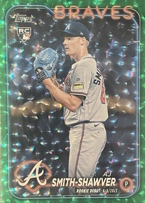 The AJ Smith-Shawver 2024 Topps Update #US316 Rookie Debut - Green Crackle Foilboard /499 card in Raw condition has moved down -$1.24 (-49.8%) in the last 30 days and was last sold for $1.25 .