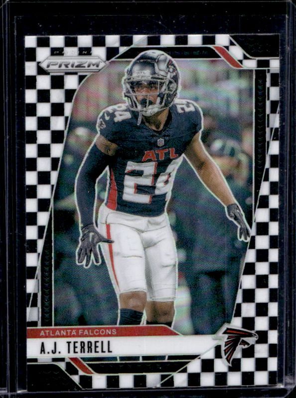 The AJ Terrell 2024 Prizm #15 Black & White Checker /(SSP) card is 1 of 83 AJ Terrell's card variations in the 2024 Prizm set being tracked by Sports Card Investor, including Base, Choice Blue Yellow Green, Choice Silver, Disco, and Green.