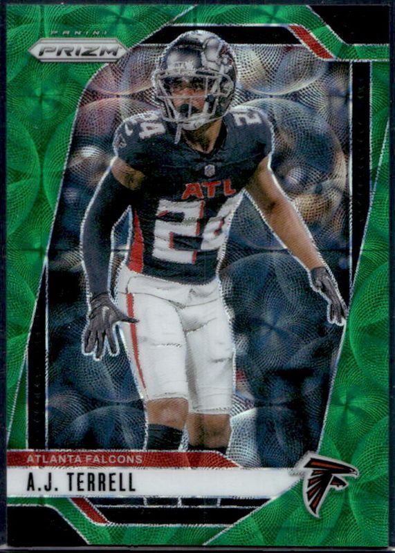 The AJ Terrell 2024 Prizm #15 Green Scope /75 card is 1 of 83 AJ Terrell's card variations in the 2024 Prizm set being tracked by Sports Card Investor, including Base, Choice Blue Yellow Green, Choice Silver, Disco, and Green.