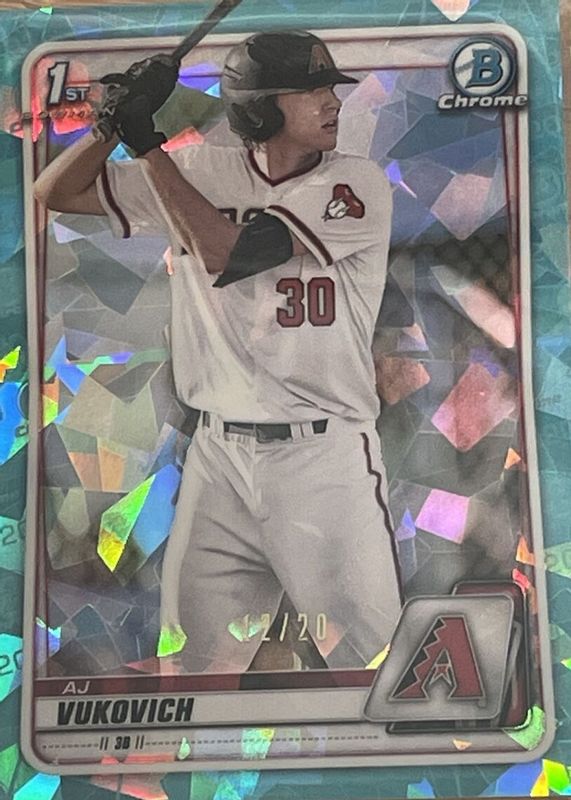 This card is 1 of 9 AJ Vukovich's card variations in the 2020 Bowman Draft Sapphire Edition set being tracked by Sports Card Investor, including Chrome (1st), Chrome - Yellow /99 (1st), Chrome - Green /50 (1st), Chrome - Orange /25 (1st), and Chrome - Gold /15 (1st).