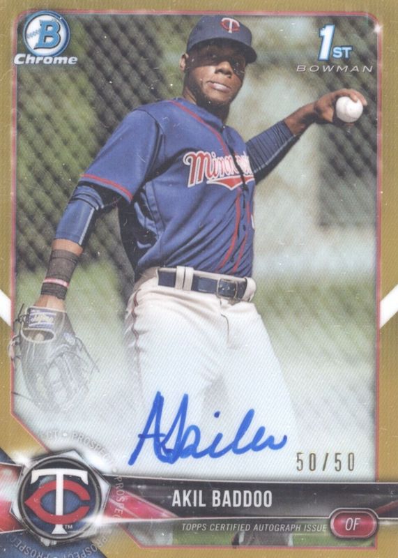 The Akil Baddoo 2018 Bowman Chrome #BCPA-AB Prospect Auto - Gold Refractor /50 (1st) card in Raw condition has not changed in price in the last 30 days and was last sold for $225.00 .