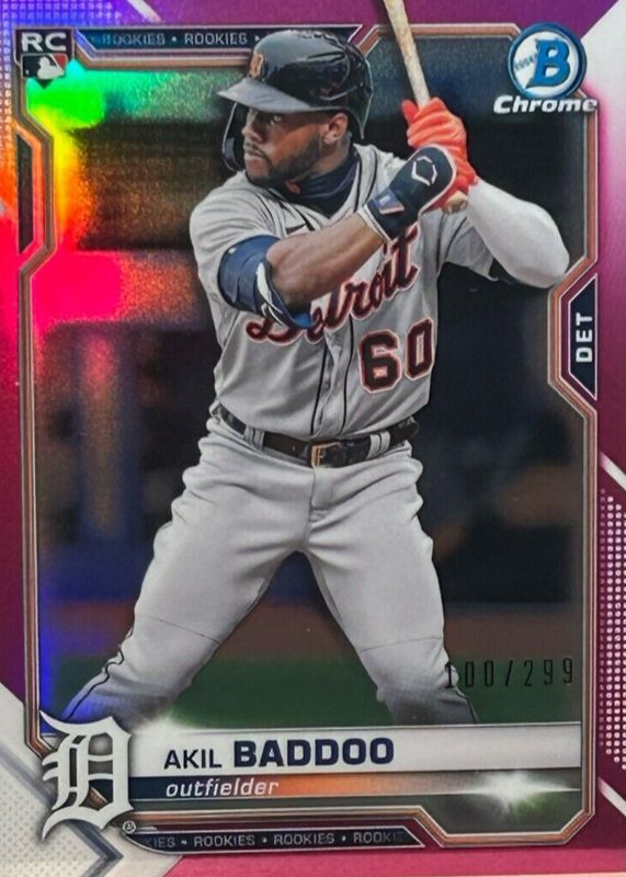 This card is 1 of 12 Akil Baddoo's card variations in the 2021 Bowman Chrome set being tracked by Sports Card Investor, including Base, Refractor /499, Purple Refractor /250, Fuchsia Refractor /199, and Blue Refractor /150.
