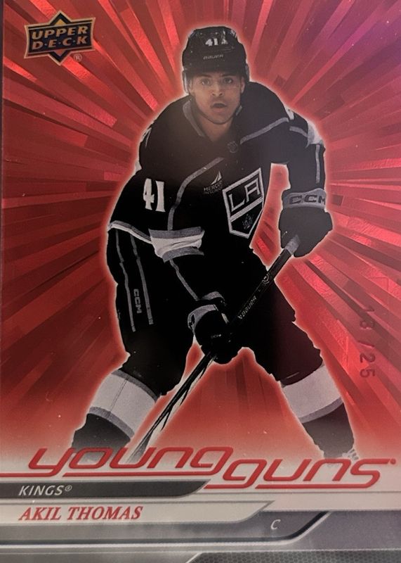 This card is 1 of 8 Akil Thomas' card variations in the 2024 Upper Deck set being tracked by Sports Card Investor, including Young Guns Base, Young Guns - Clear Cut, Young Guns - Outburst Silver, Young Guns - Deluxe /250, and Young Guns - UD Exclusives /100.