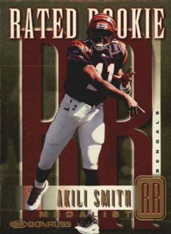 The Akili Smith 1999 Donruss #RR10 Rated Rookies Medalist /250 card is 1 of 7 Akili Smith's card variations in the 1999 Donruss set being tracked by Sports Card Investor, including Base, Stat Line Career /223, Stat Line Season /14, Rated Rookie /5000, and Rookie Gridiron Kings /5000.