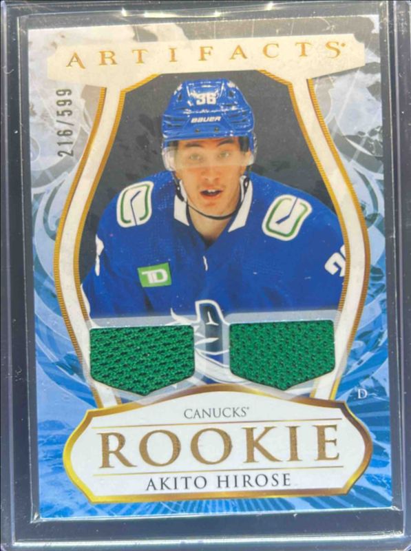 The Akito Hirose 2023 Upper Deck Artifacts #181 Material - Gold /199 Rookie card is 1 of 28 Akito Hirose's card variations in the 2023 Upper Deck Artifacts set being tracked by Sports Card Investor, including Base /999, Leather, Plexi, Turquoise, and Wood.
