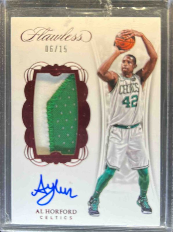 The Al Horford 2017 Flawless #VP-AH Vertical Patch Auto - Ruby /15 card is 1 of 44 Al Horford's card variations in the 2017 Flawless set being tracked by Sports Card Investor, including Base /5, Double /10, Triple /5, Bronze FOTL /2, and Platinum /1.