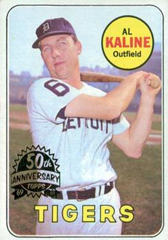 The Al Kaline 2018 Topps Heritage #410 50th Anniversary Buybacks card is 1 of 10 Al Kaline's card variations in the 2018 Topps Heritage set being tracked by Sports Card Investor, including Real One Autographs, Real One Autographs - Red Ink /69, 1969 U.S. Postage Stamp Relics /50, Flashbacks Autographs Relics /25, and 1969 Mint Relics - Nickel /15.