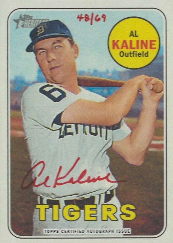 The Al Kaline 2018 Topps Heritage #ROA-AK Real One Autographs - Red Ink /69 card in Raw condition has not changed in price in the last 30 days and was last sold for $149.99 .