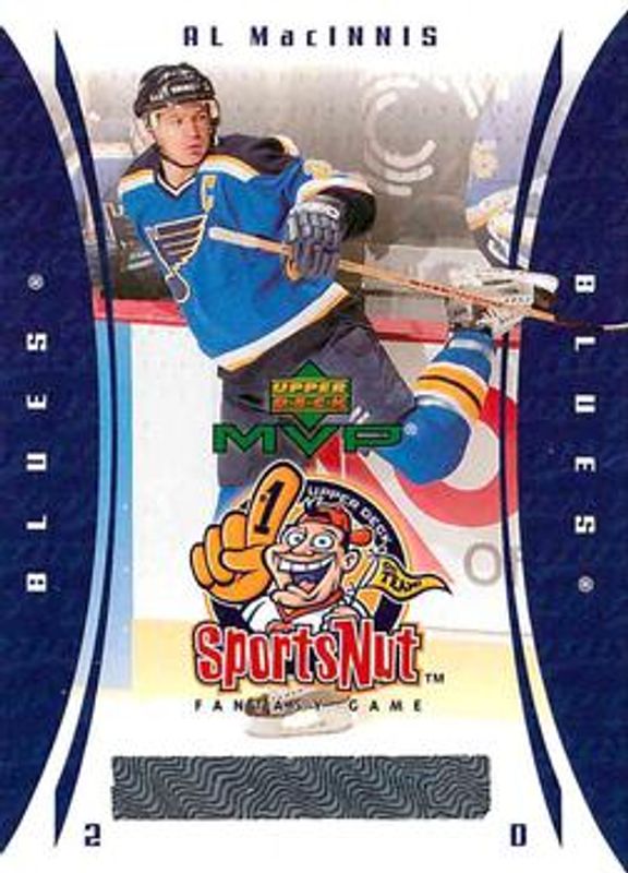 The Al MacInnis 2003 Upper Deck MVP #SN77 SportsNut card is 1 of 6 Al MacInnis' card variations in the 2003 Upper Deck MVP set being tracked by Sports Card Investor, including Base, Silver Script /150, Gold Script /25, Red Script /25, and Threads Of Change /100.